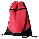 Augusta Tricolor Drawstring Backpack. 210-denier nylon with PU coating* Hemmed top with drawcord closure* Zippered front pocket* Black bottom with white accent piping* Web tab at bottom corner for reinforcement 14 x 18,